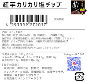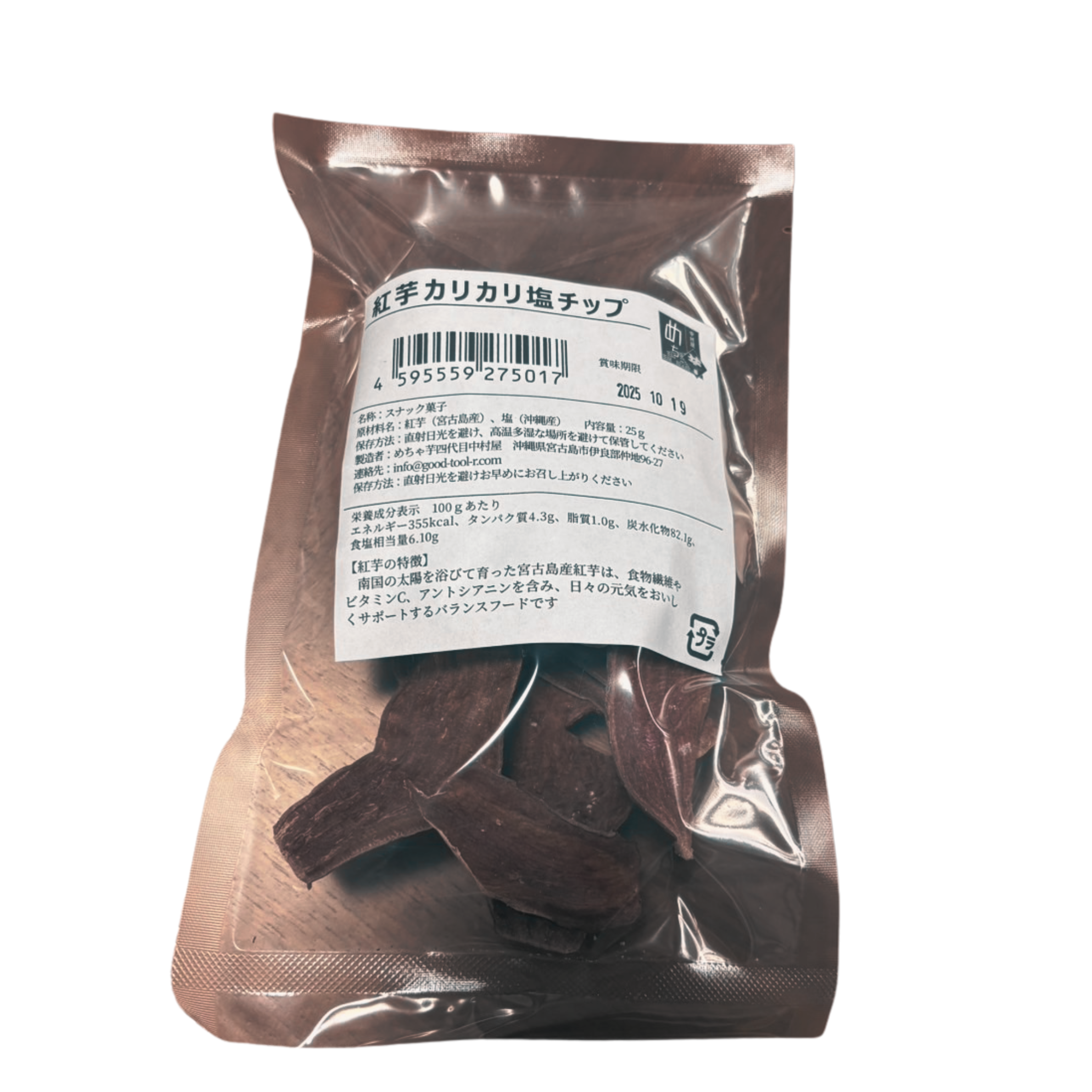 希少な宮古島産紅芋を油は一切使わずに丁寧に焼き上げ、沖縄の海水塩をまぶした「100%天然素材」のチップスです